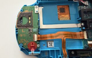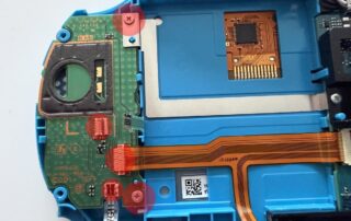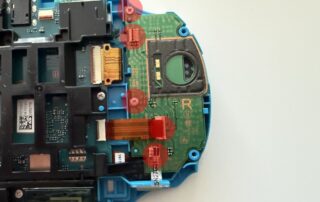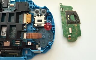To remove the left joystick module, we first need to carefully disconnect three flex cables. The flex cable connectors are the locking type, so we lift the brown and black clips on the back of the connectors to 90°. We also remove the two Phillips screws that attach the PCB to the case and separate the PCB from the case. There’s one Phillips screw holding the joystick module in place. We remove that too, place our new module, and reverse all the steps.