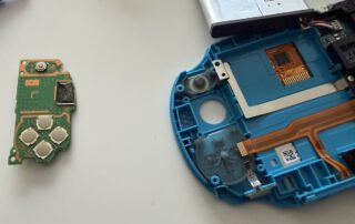The right joystick module is removed in a similar way. On this side, there’s the action buttons (△○✕□) and the R button PCB.