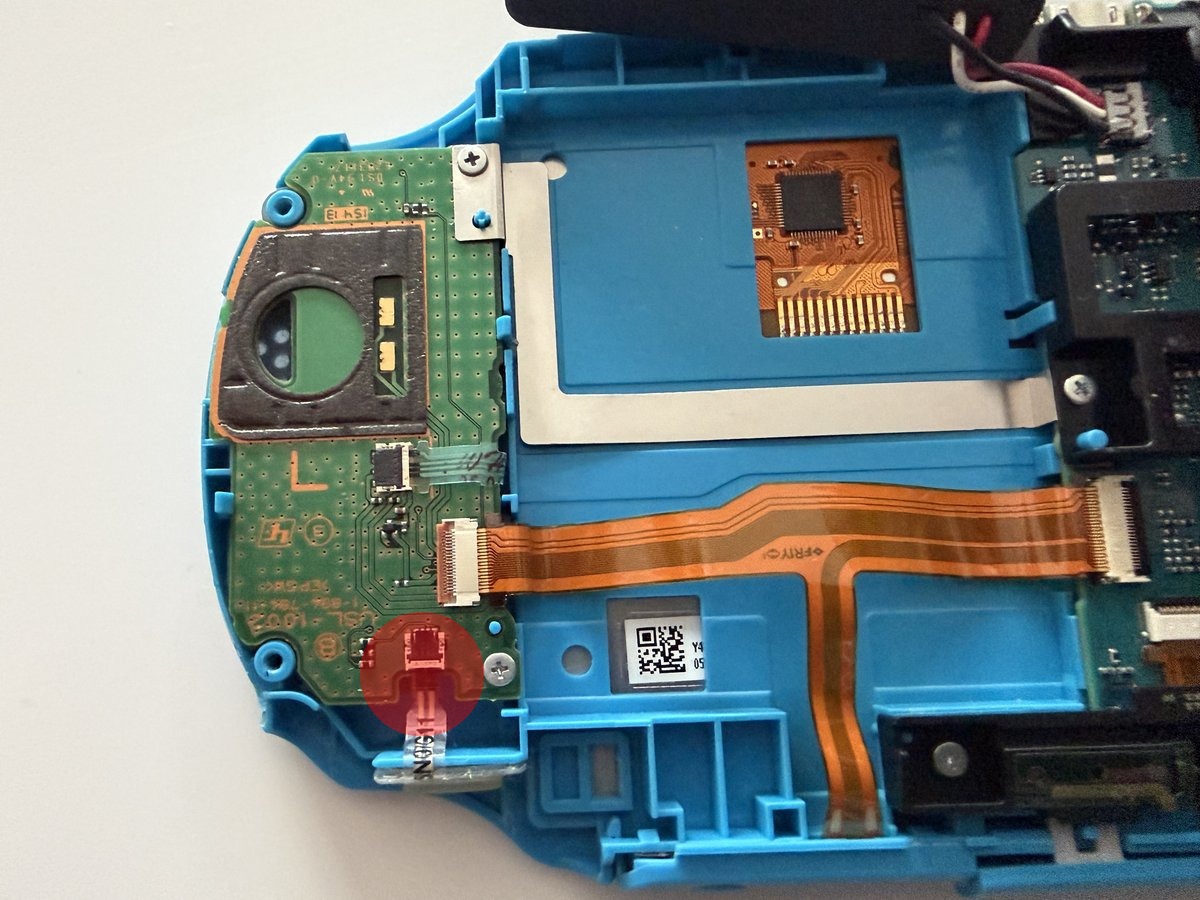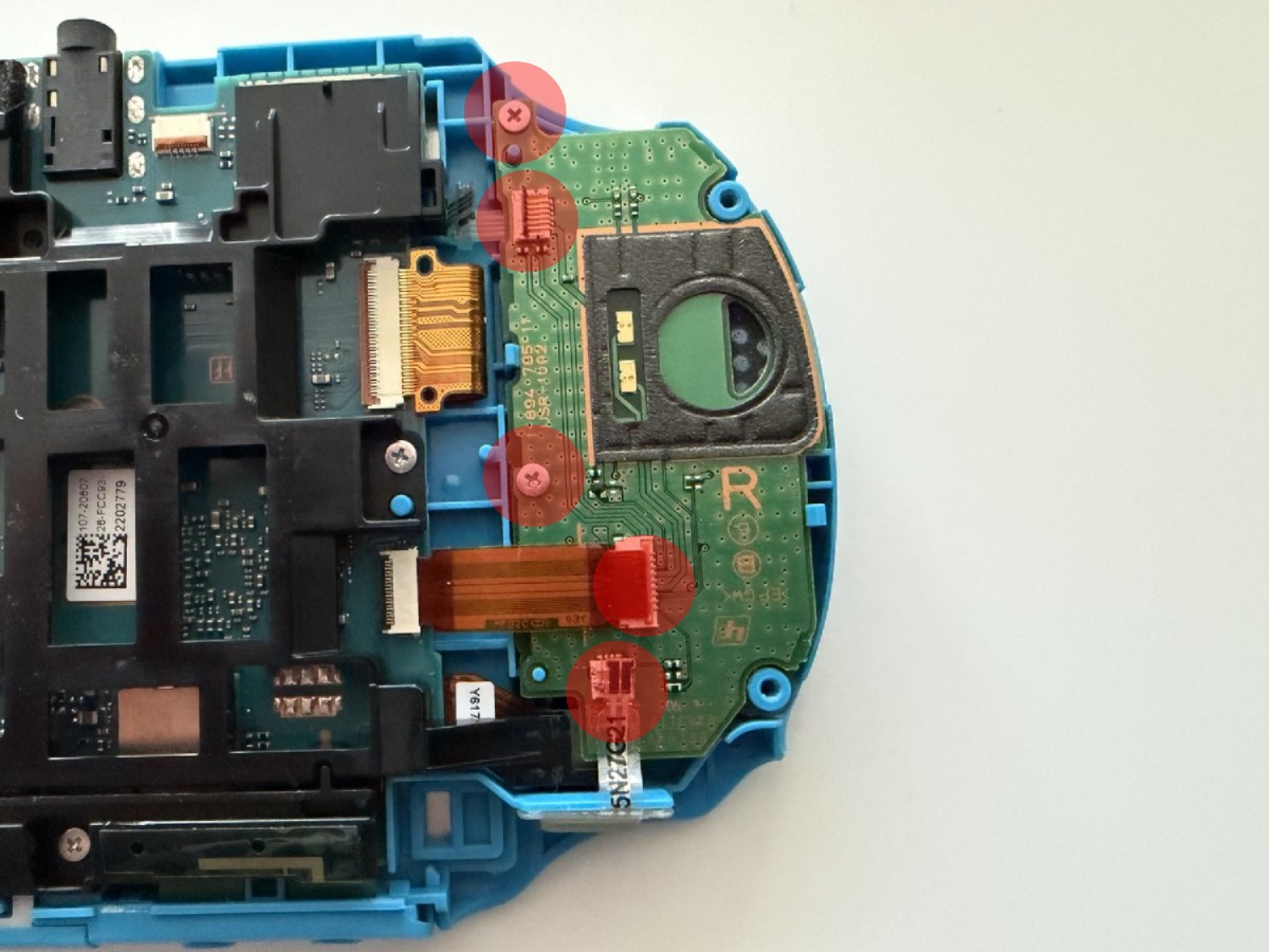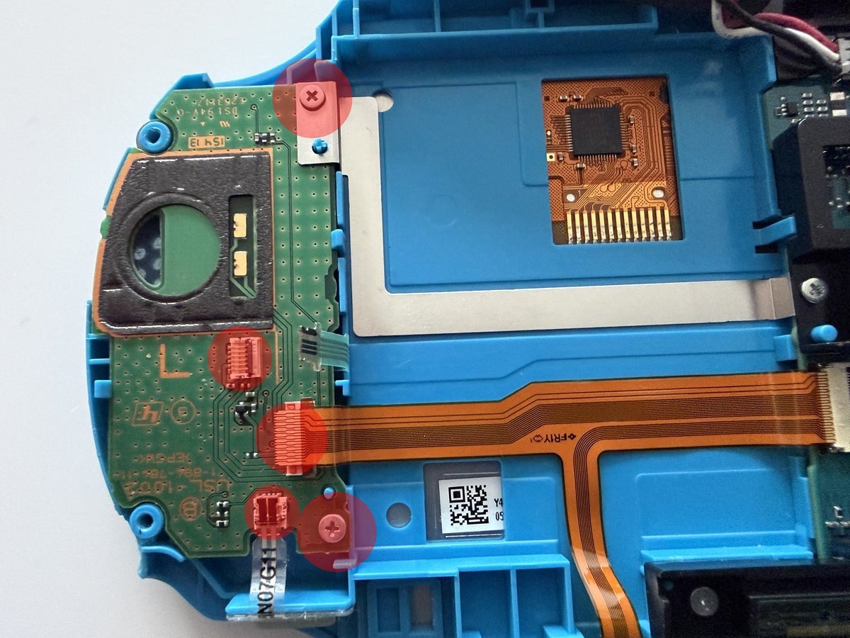 To remove the left joystick module, we first need to carefully disconnect three flex cables. The flex cable connectors are the locking type, so we lift the brown and black clips on the back of the connectors to 90°. We also remove the two Phillips screws that attach the PCB to the case and separate the PCB from the case. There’s one Phillips screw holding the joystick module in place. We remove that too, place our new module, and reverse all the steps.