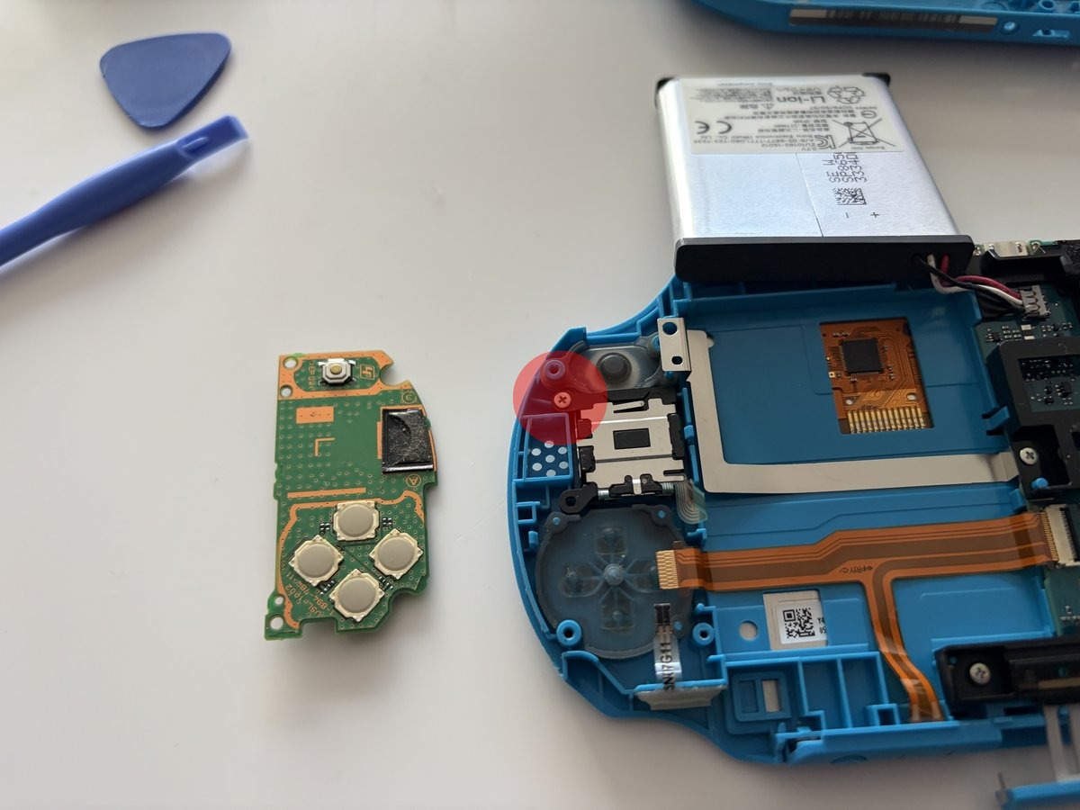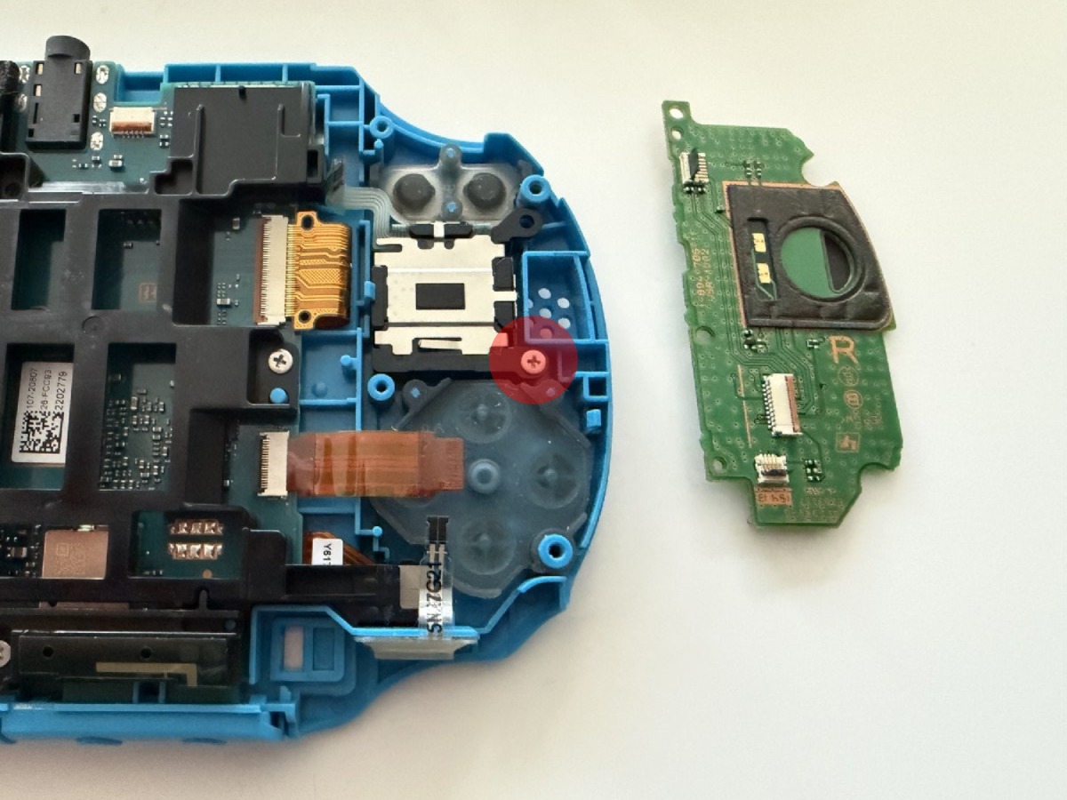 The right joystick module is removed in a similar way. On this side, there’s the action buttons (△○✕□) and the R button PCB.